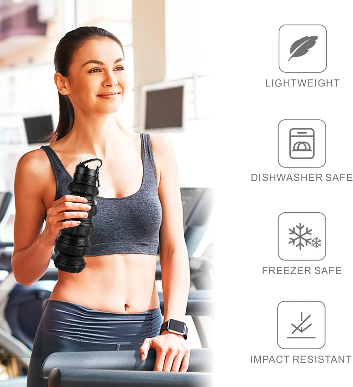 **Product Title:** Collapsible Travel Water Bottle 19.6 oz – Reusable Silicone Foldable Water Bottle with Carabiner, Leak-Proof and Portable for School, Office, Gym, Camping, and Hiking (Black)